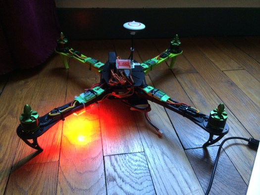 J’ai mis du temps à le terminer. Il s’agit basiquement d’un châssis SK450 équipé d’un contrôleur DJI Naza-M V2 équipé d’un train rétractable et d’une nacelle stabilisée 2 axes capable d’accueillir une caméra type GoPro. Bref une caméra volante assez similaire à un Phantom en légèrement plus grand.